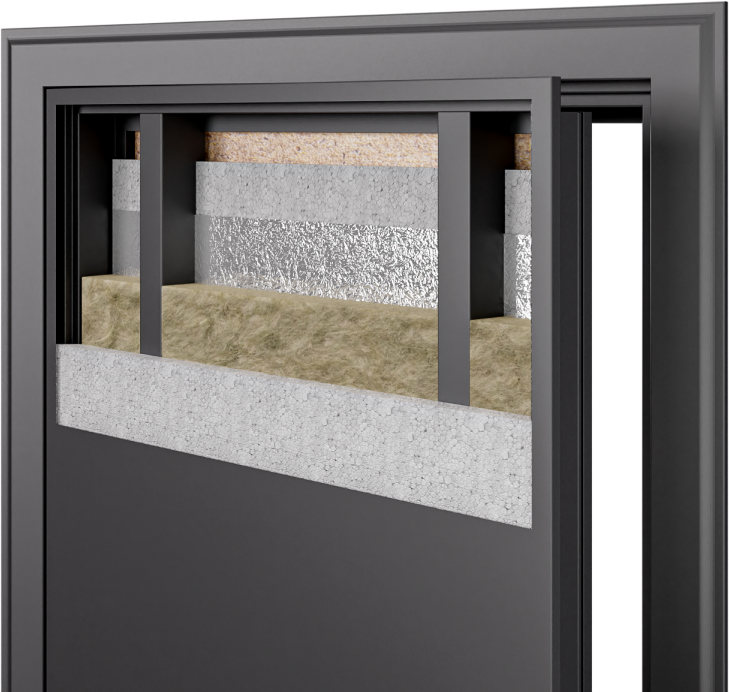 Ключевое преимущество данной модели - наличие терморазрыва, который обеспечивает превосходную теплоизоляцию и предотвращает образование мостиков холода. Система трех контуров уплотнения с профилем D гарантирует герметичность конструкции, исключая проникновение холодного воздуха, влаги и посторонних звуков. Толщина полотна 96 мм в сочетании с двухслойным наполнением из минеральной плиты и пенополистирола высокой плотности обеспечивает отличные тепло- и шумоизоляционные характеристики.