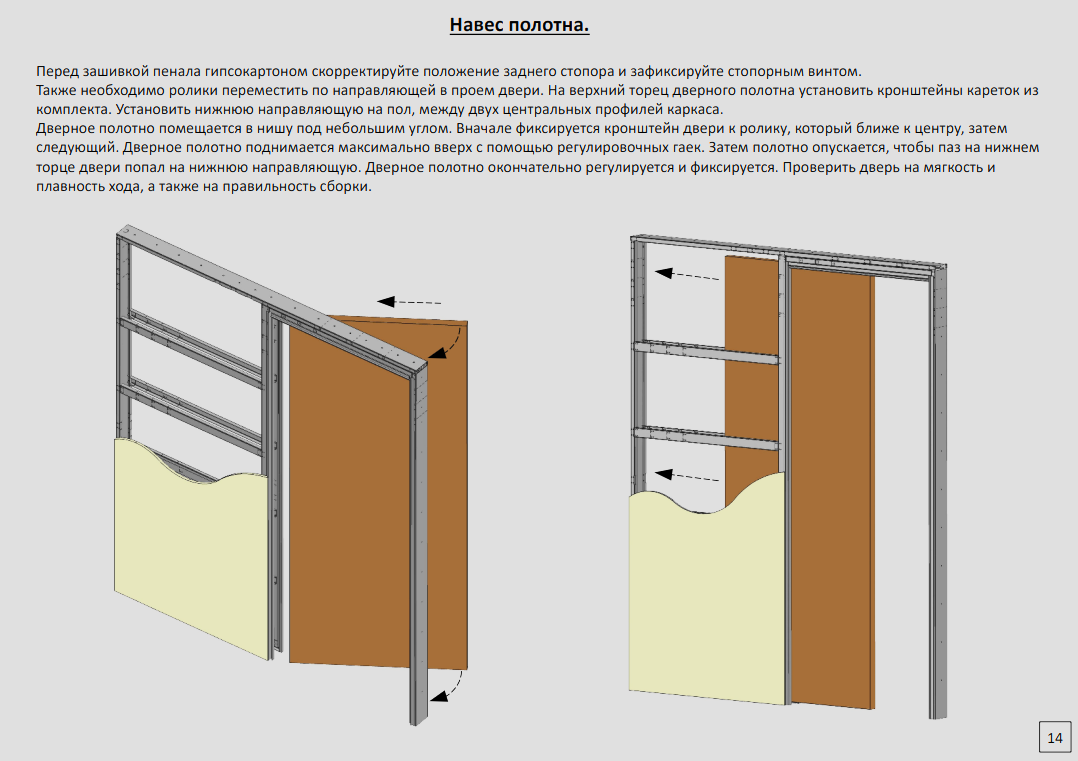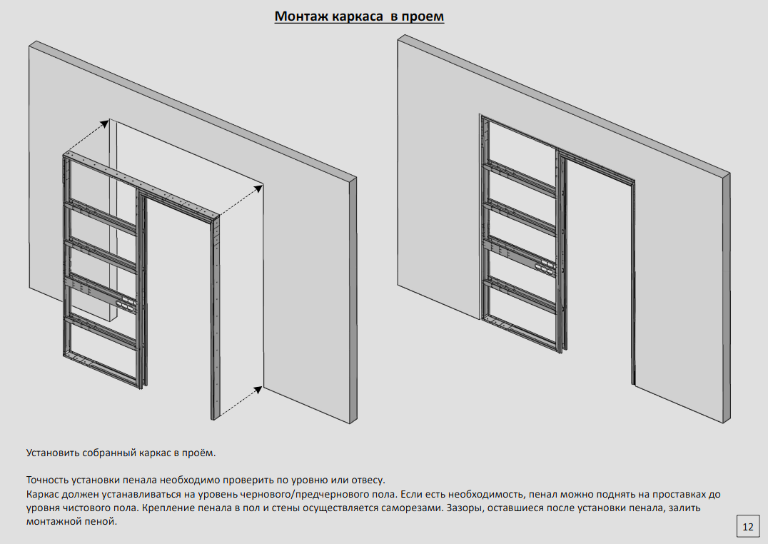 Каркас для раздвижных дверей устанавливается в проем во время проведения ремонтных работ на стадии черновой отделки, или в самом конце ремонта (главное условие - на уровень чернового пола ( уровень чистового пола 13 мм)) и обшивается, ГВЛ, Фанера и/или гипсокартоном для последующей отделки чистовыми строительными материалами, например обоями, краской или декоративной штукатуркой.