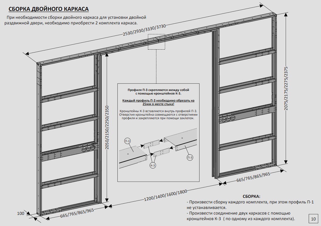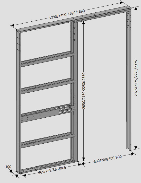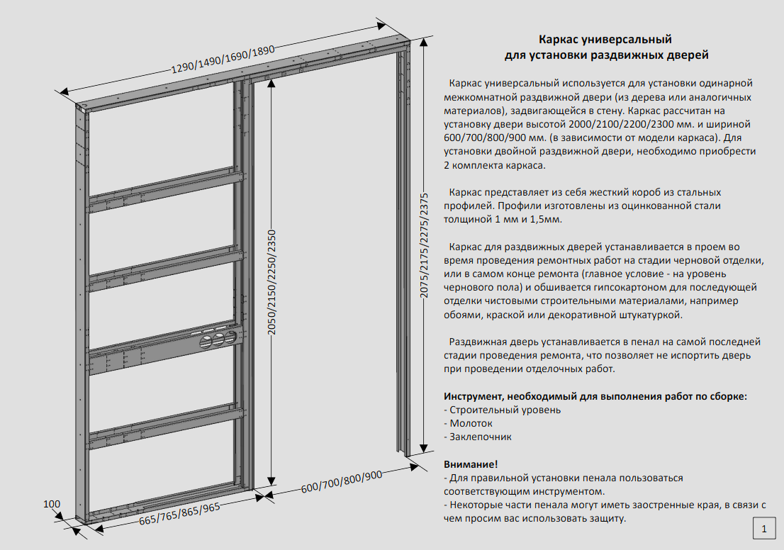 Каркас универсальный используется для установки одинарной межкомнатной раздвижной двери (из дерева или аналогичных материалов), задвигающейся в стену. Каркас рассчитан на установку двери высотой 2000/2100/2200/2300 мм. и шириной 600/700/800/900 мм. (в зависимости от модели каркаса). Для установки двойной раздвижной двери, необходимо приобрести 2 комплекта каркаса.