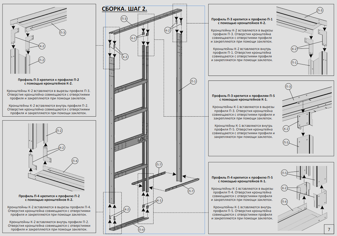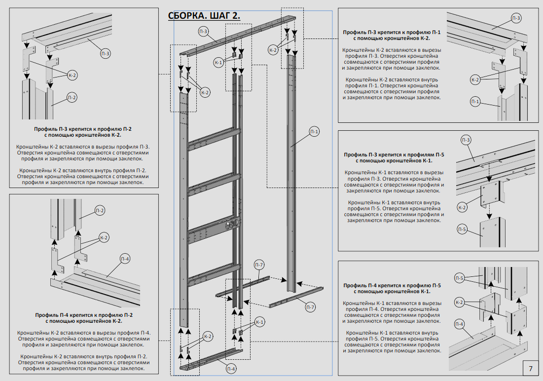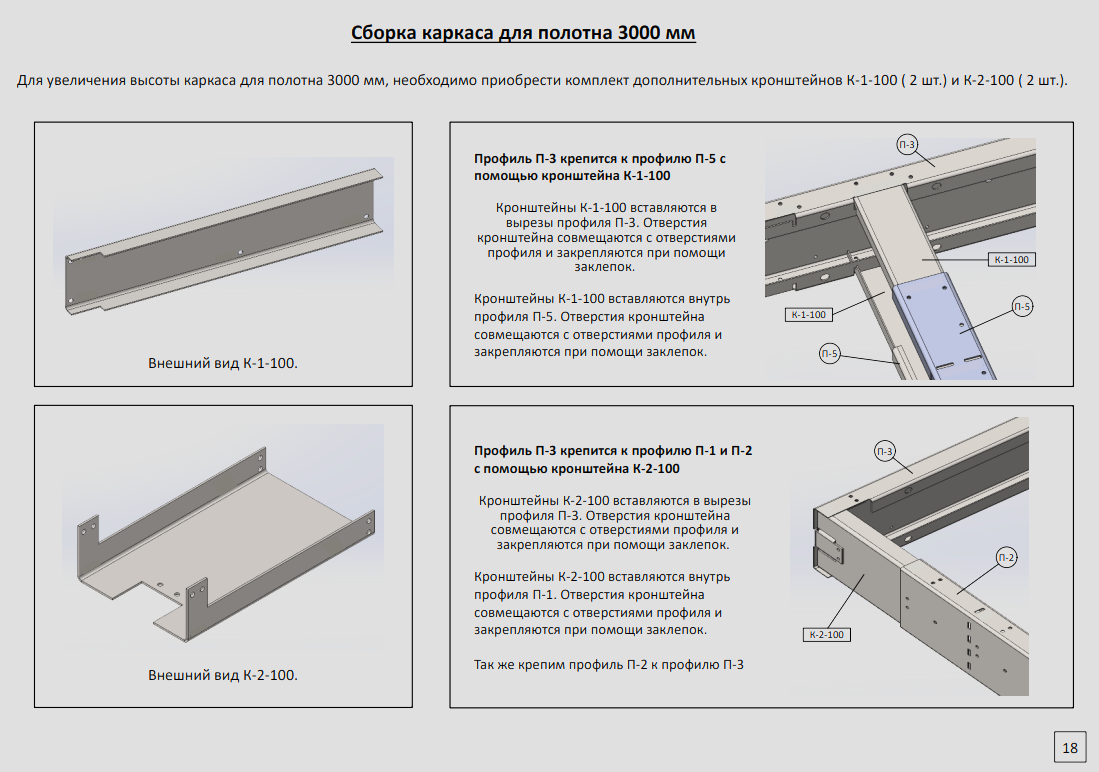 Профиль П-3 крепится к П-1 и П-2 с помощью К-2-100. Кронштейны вставляются в вырезы и фиксируются заклепками.