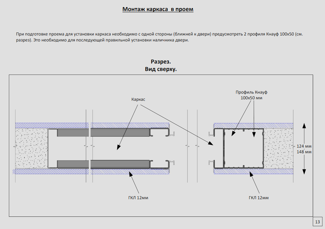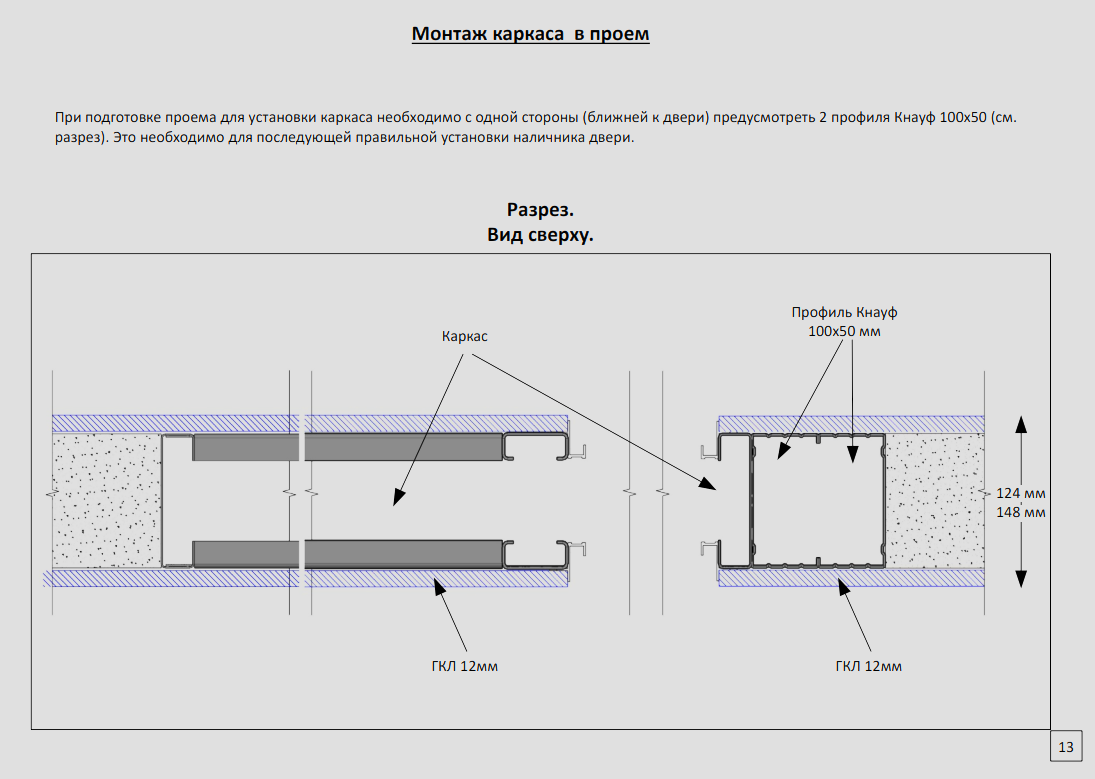 При подготовке проема для установки каркаса необходимо с одной стороны (ближней к двери) предусмотреть 2 профиля Кнауф 100х50 (см. разрез). Это необходимо для последующей правильной установки наличника двери.