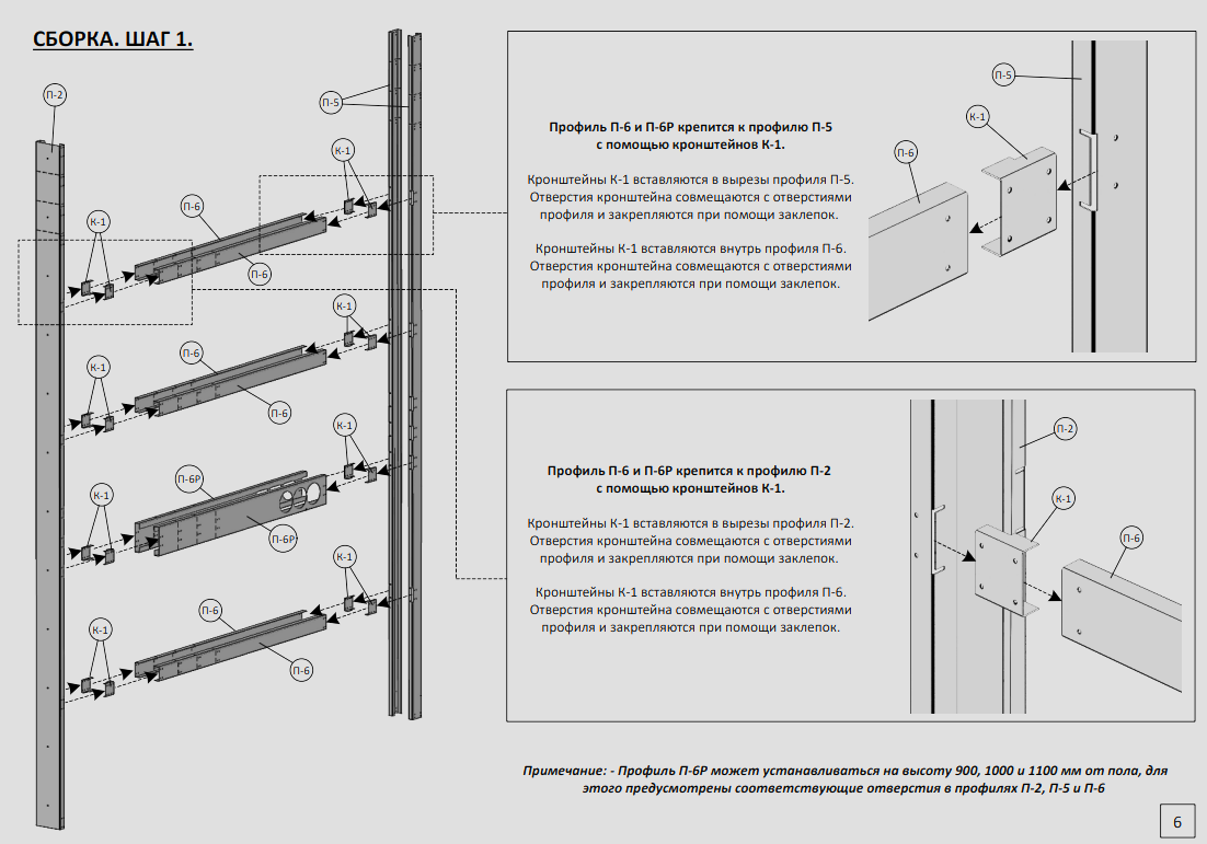 Профиль П-3 крепится к П-5 с помощью кронштейна К-1-100. Кронштейны вставляются в вырезы профиля и фиксируются заклепками.